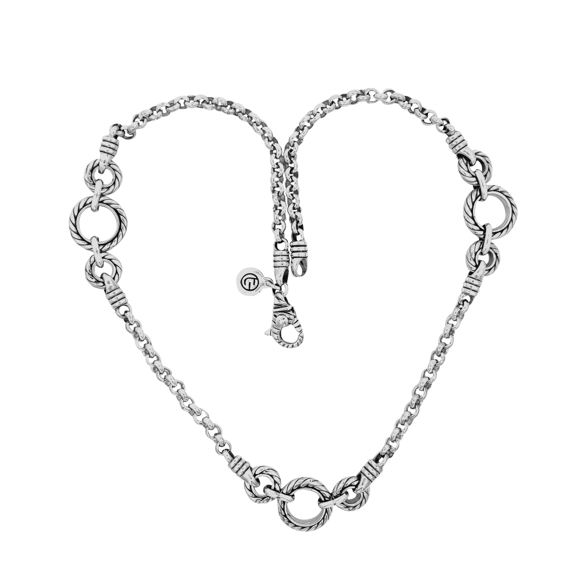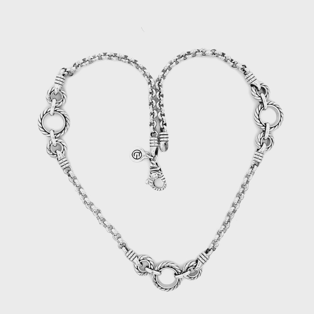 Introducing the Amar necklace with a dainty design and show-stopping triple charm center. Small link: 10mm x 10mm, Large link: 15mm x 15mm, Chain: 4mm.