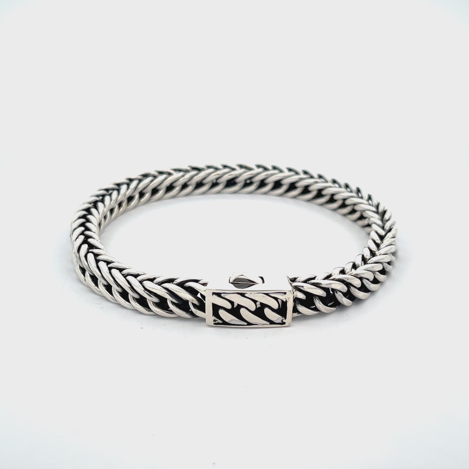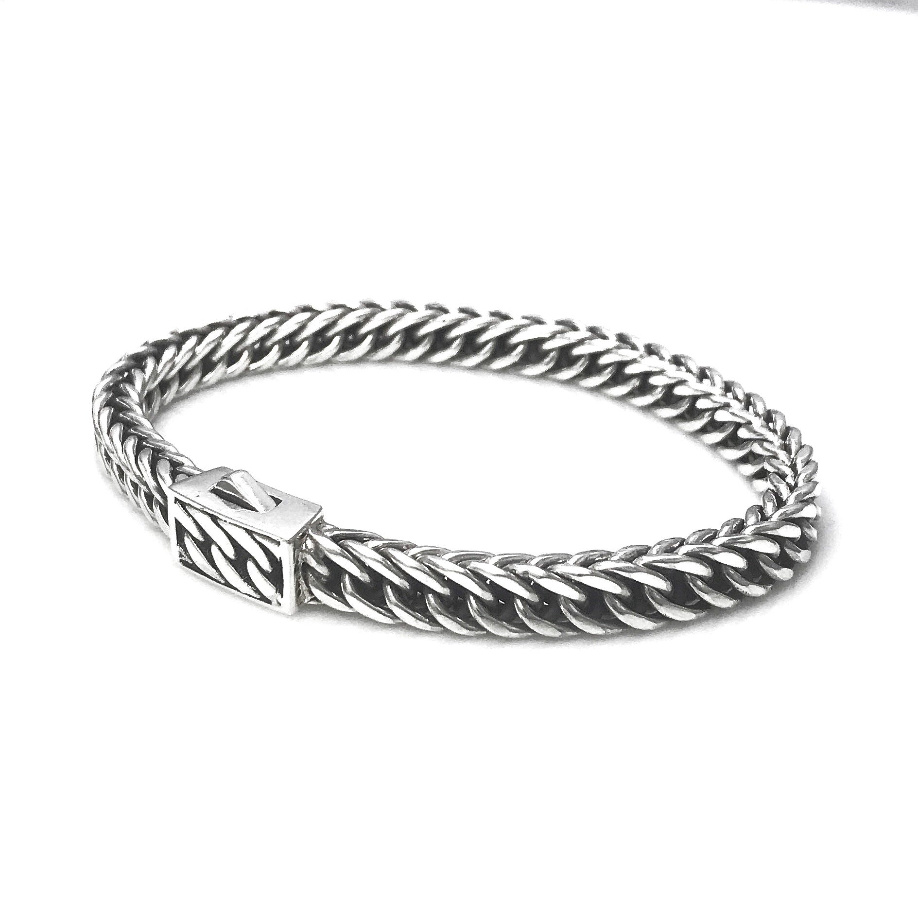 The Ari bracelet showcases a minimal design with a modern rendition of a cuban link chain, emulating the popular “chainmail” look worn by warriors of the ancient world. This bracelet has a consistent pattern through and through— unwavering in its attempt to represent functional metal pieces.