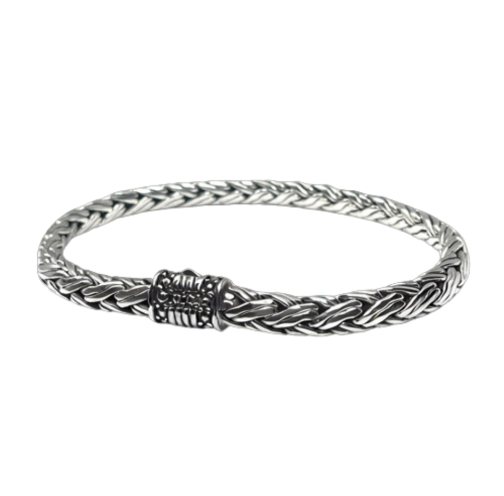 The Garo bracelet is appreciated by those that value harmonizing patterns. Designed by our expert craftsman, this bracelet is representative of Balinese culture and lifestyle. This design showcases a double braided chain with a dotted clasp hugged with stripes.