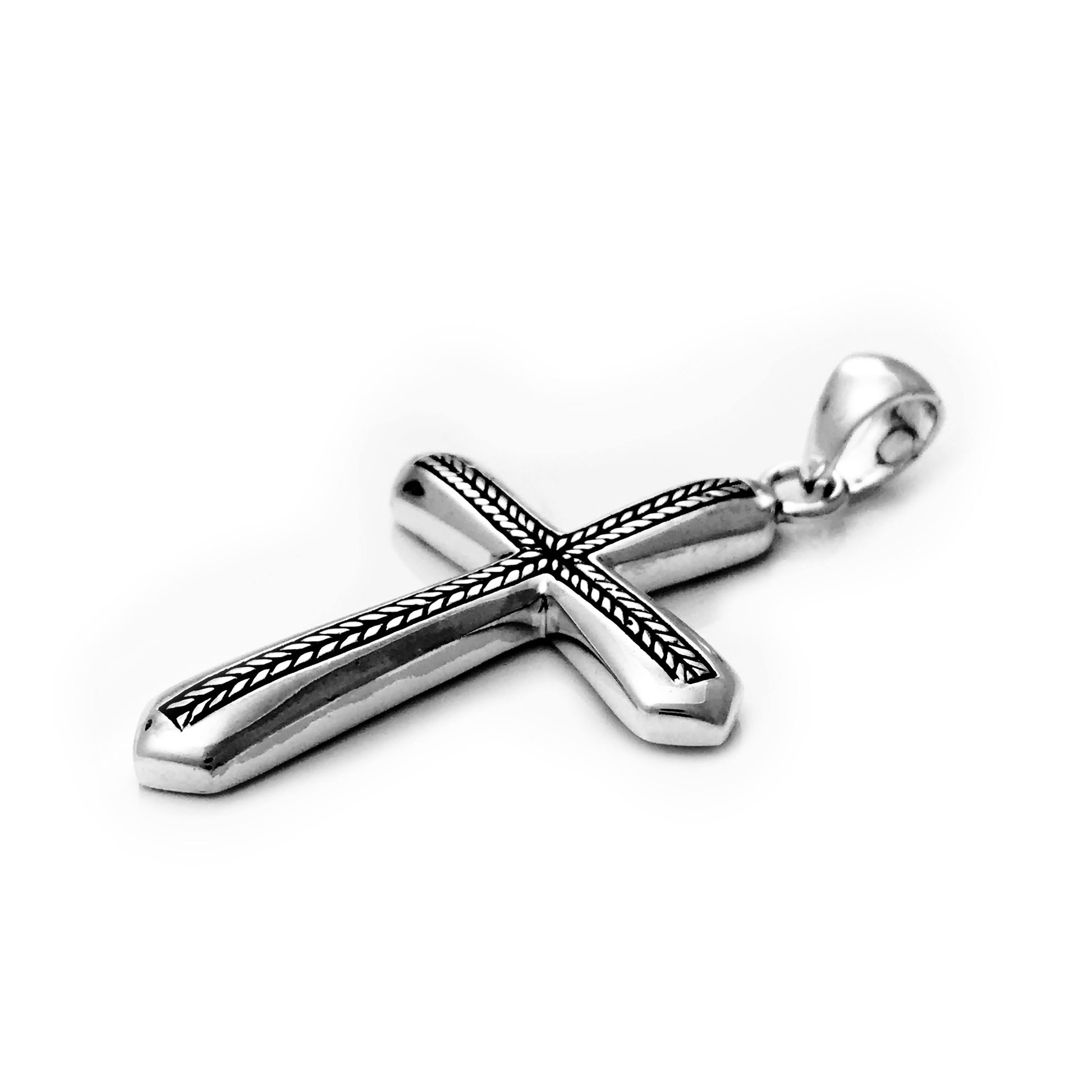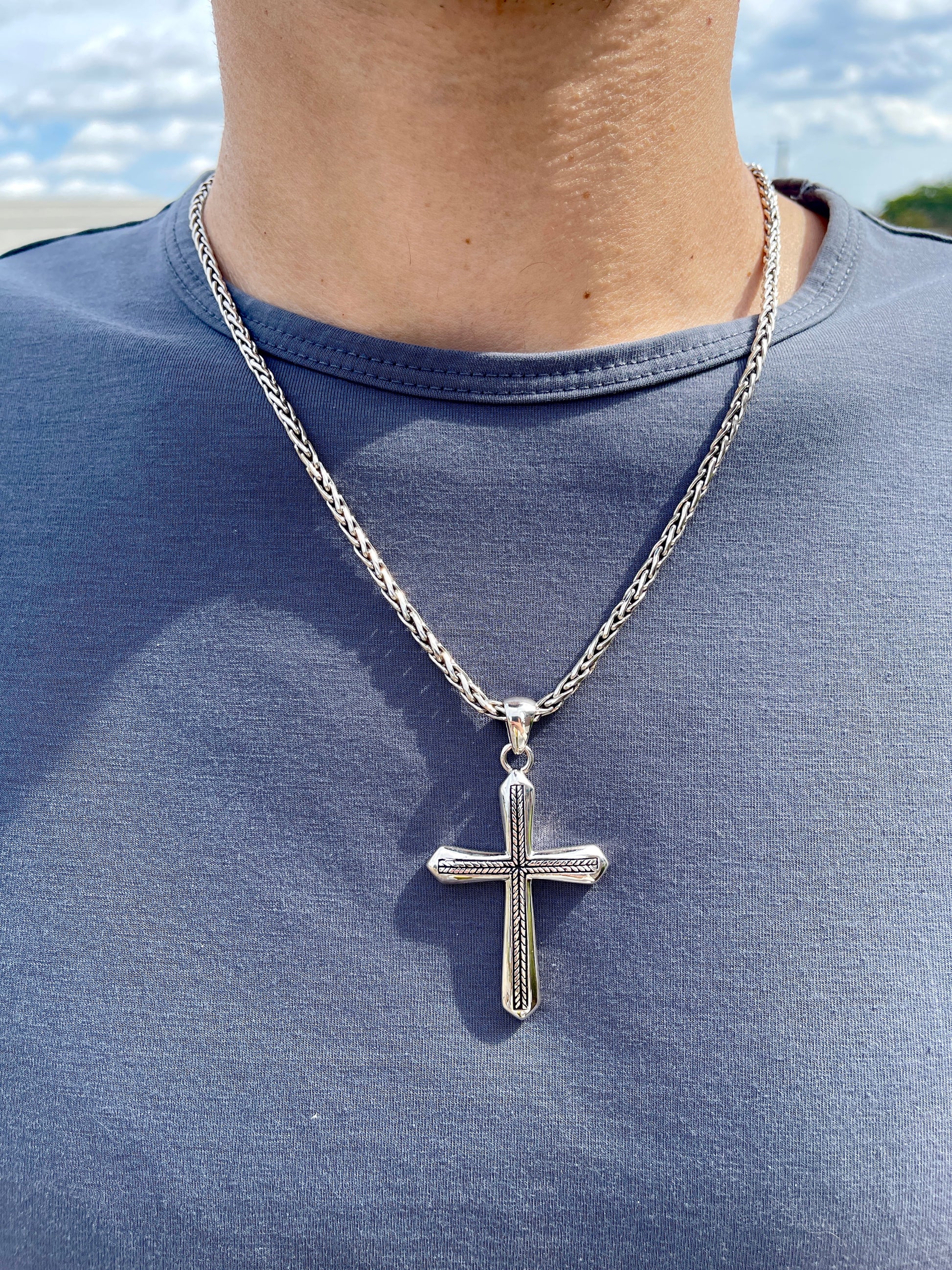 The Heros cross has a subtle yet beautiful wheat pattern running down and across its center. This cross is complementary for daily wear or a special occasion because it is intricate enough for fancy occasions, but muted enough to be a modest yet decorated design for daytime wear.