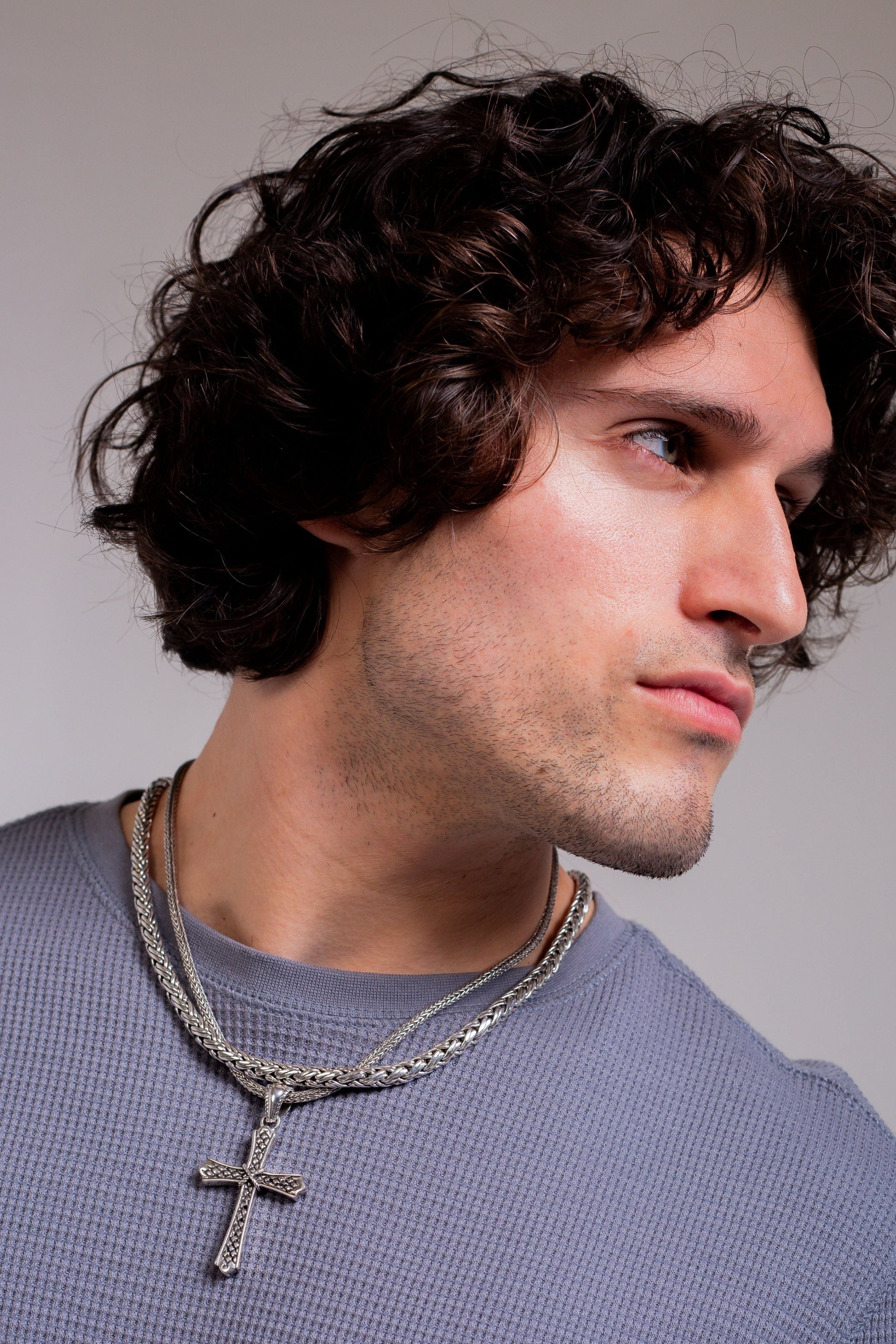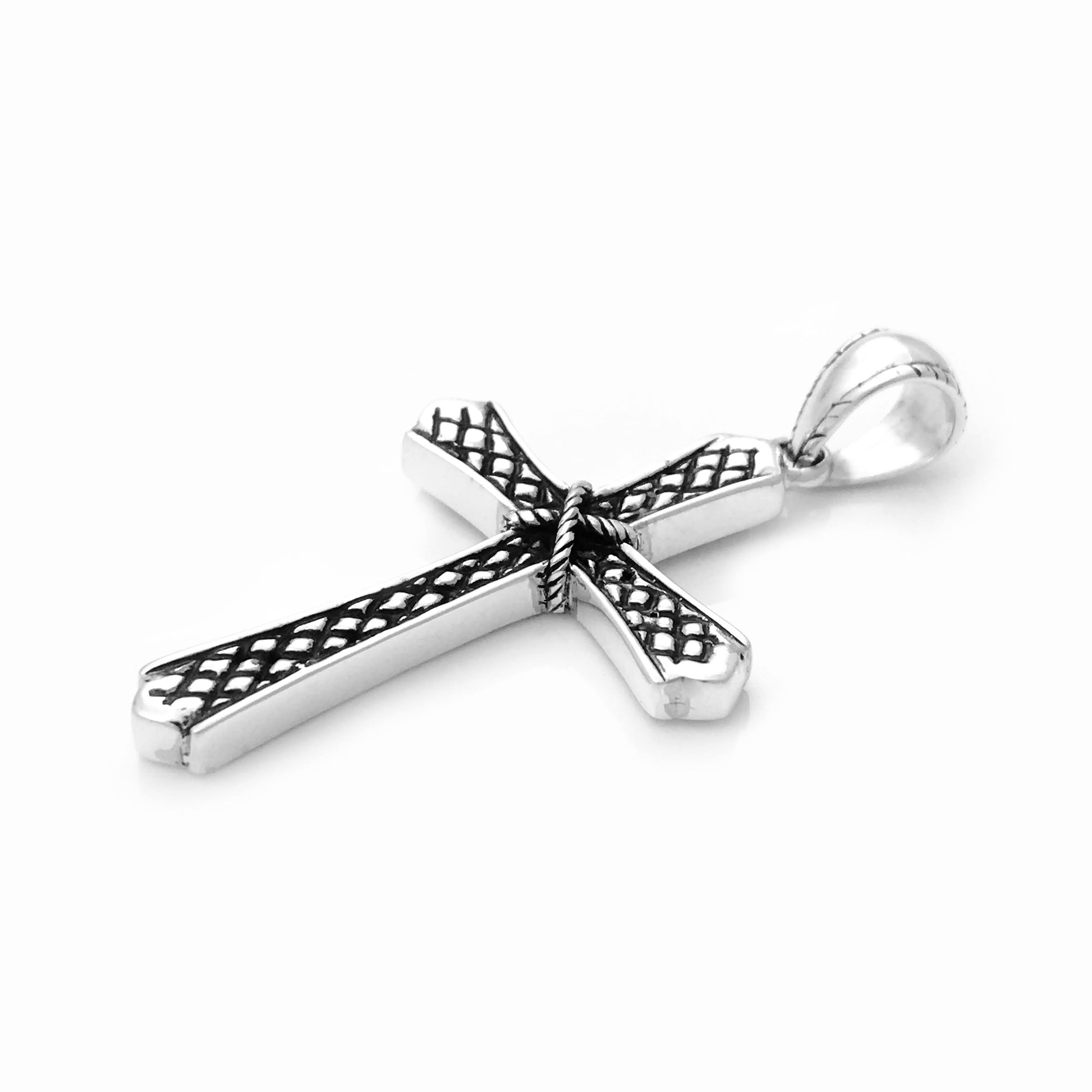 The Krikor cross features a beautiful and subdued diamond pattern with a criss-cross of overlapping wire, which secures the center of the piece. This cross has a bit of dimension with the criss-crossed center, making it subtlety interesting without looking too overdone.