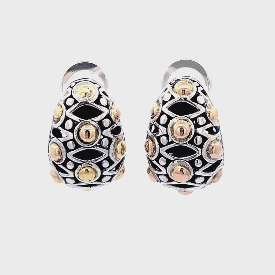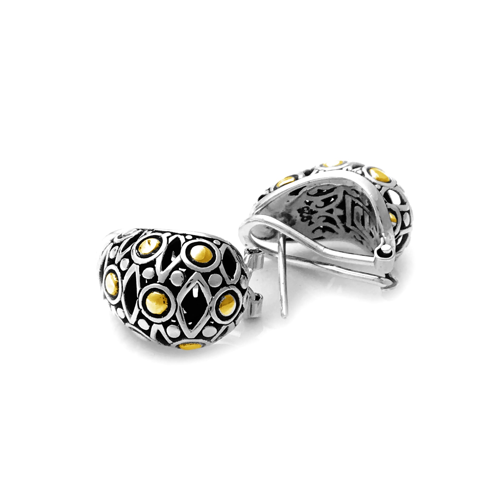 The Madlen earrings are a two-toned version of the Nanor earrings. Still embodying the concept of a sweet lullaby, this variation is a bit more electrifying with the dotted gold accents. These earrings have an omega-back, securing the piece comfortably on the earlobe.