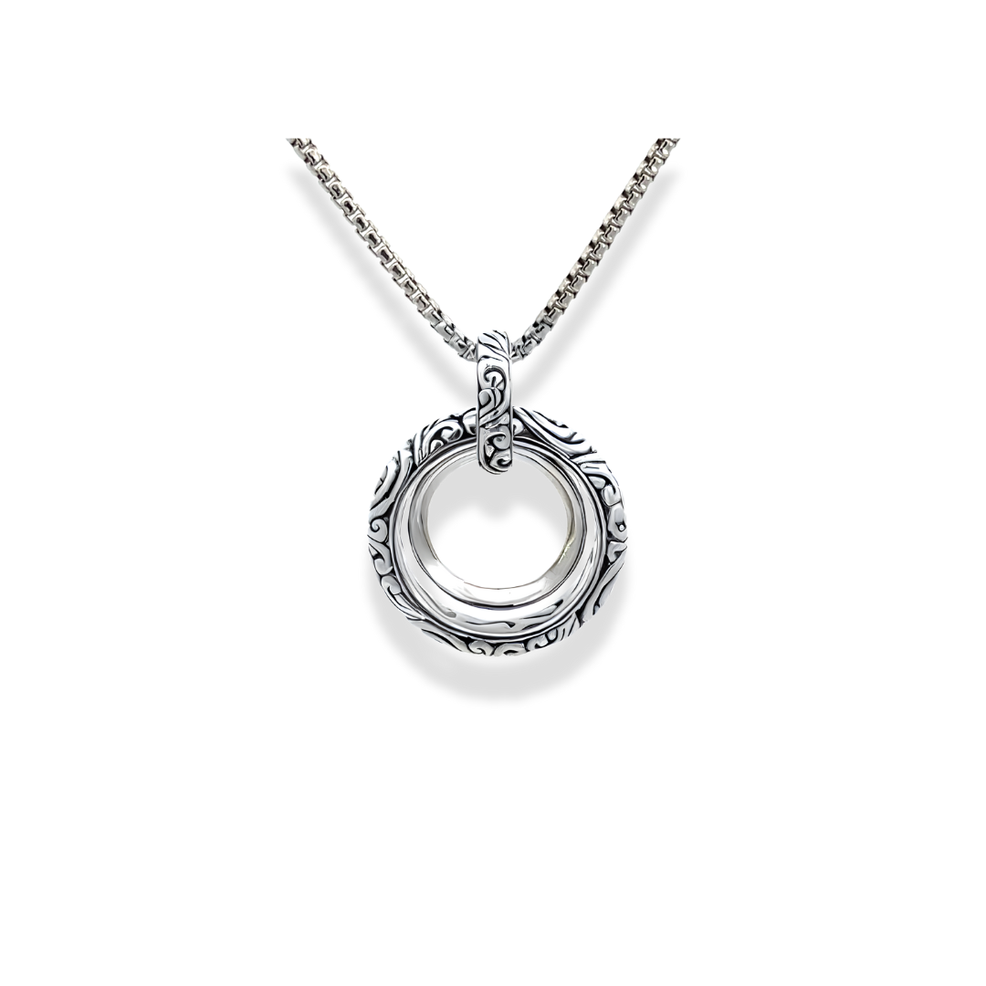 Crafted amidst the artistic allure of Bali, the "Marina" necklace embodies the essence of the sea with every meticulously shaped detail. Fashioned from sterling silver, the pendant features an intricate design that evokes the gentle ebb and flow of ocean waves. A timeless piece that whispers tales of the sea to those who wear it.