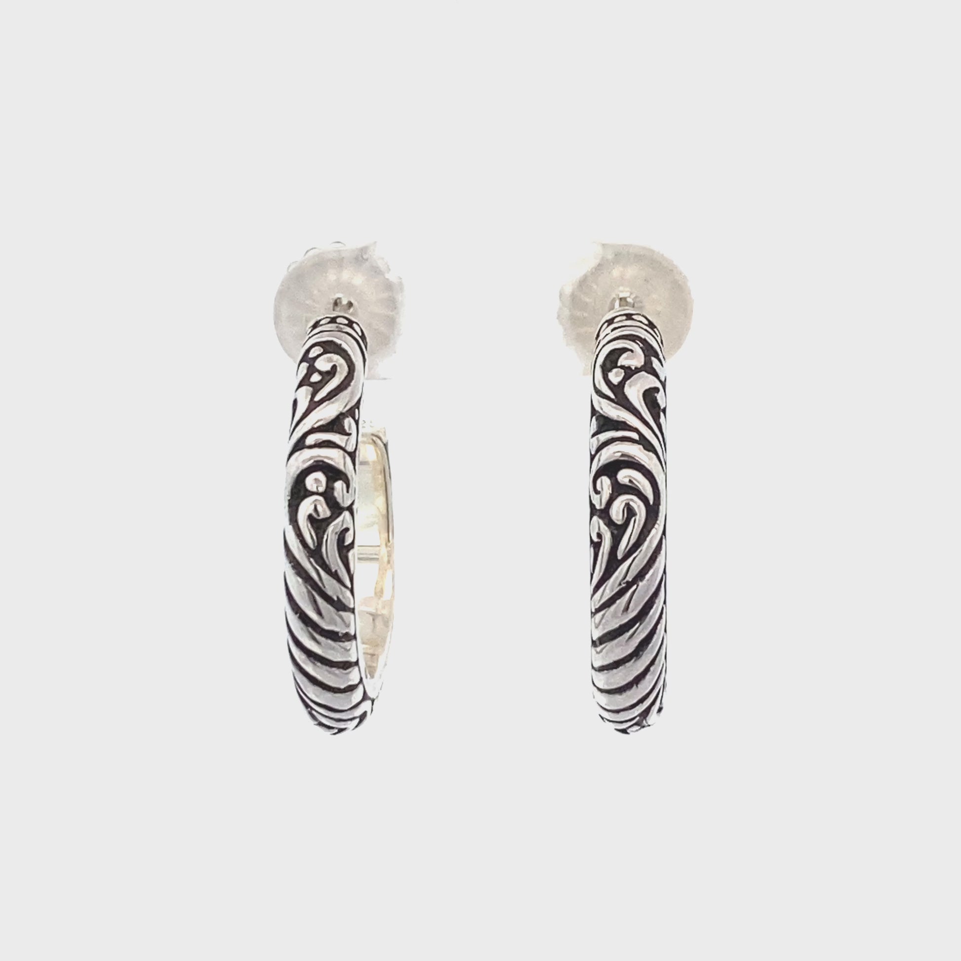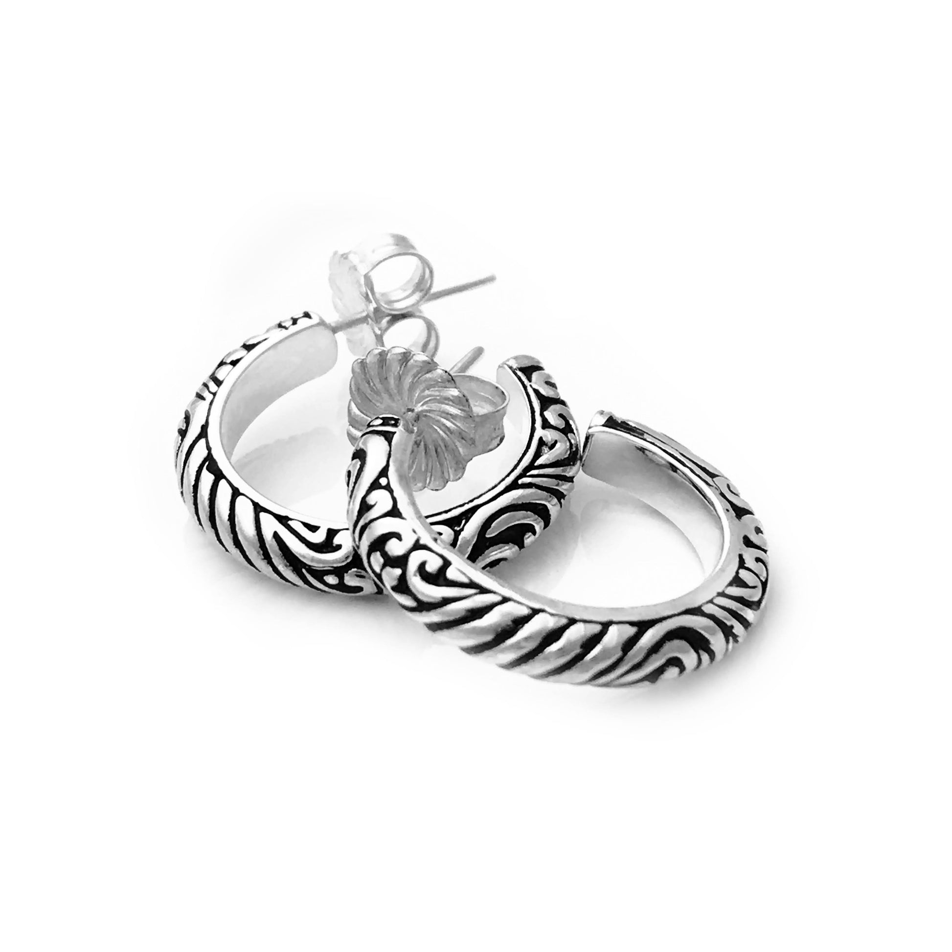 The Maro hoops are a fancy, interesting approach to the Balinese scrollwork and traditional detail. These hoops have a beautiful balance of swirls and longer roped sections. It is difficult to decipher where one pattern ends and there are other beings because of the gorgeous fluidity of the design.