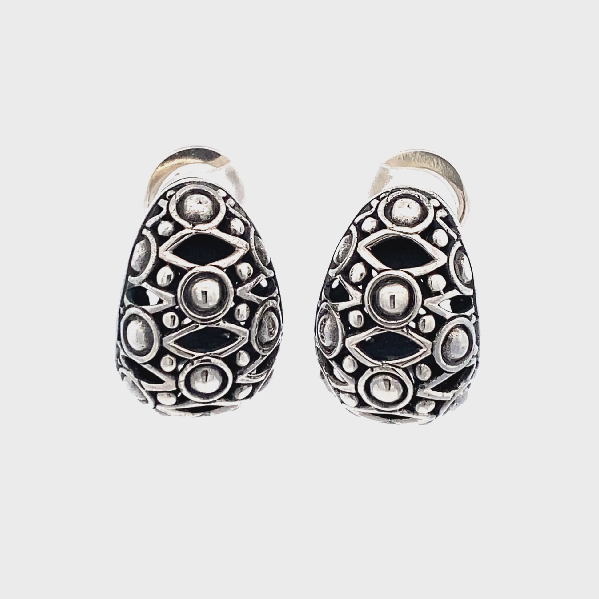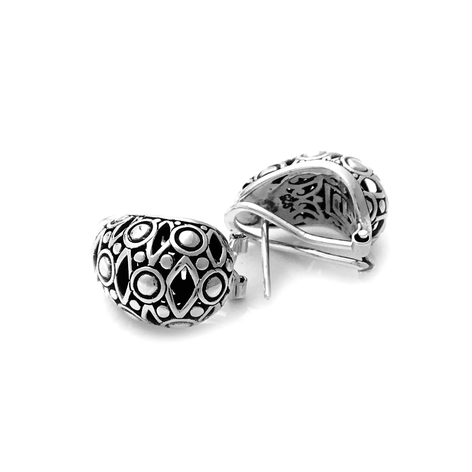 The Nanor earrings are inspired by a lullaby that is sung to a young child, soothing them into slumber. These omega-back earrings feature both circle and diamond patterns that are beautifully complementary and are a representation of the dreamy talent of our craftsman.
