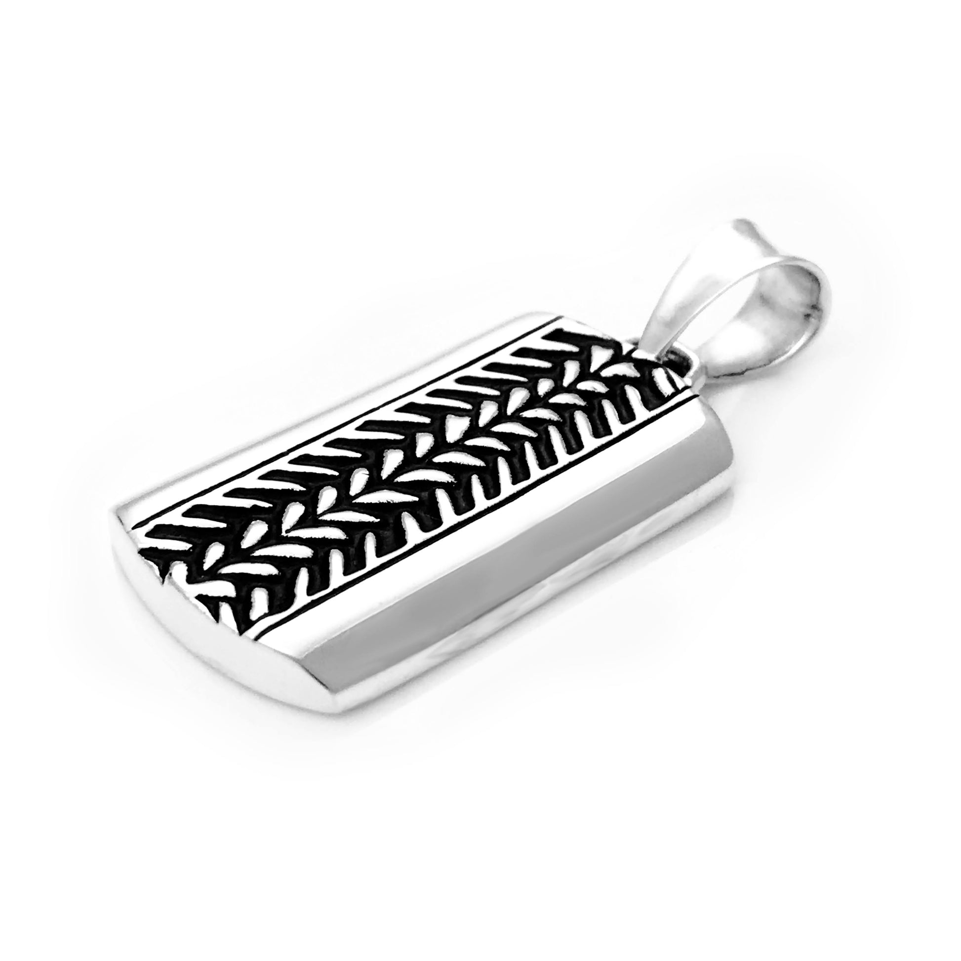 The Razmig pendant is yet another dog tag design that features a spinal-like pattern. A bit more visually zippy than the Vahan, but more rigid than the Levon. The interlocking spinal center is also accentuated by the black antiquing on the recessed areas. The Razmig pendant was inspired by true warriors, as they are expected to utilize their entire bodies and selves into honorable efforts.