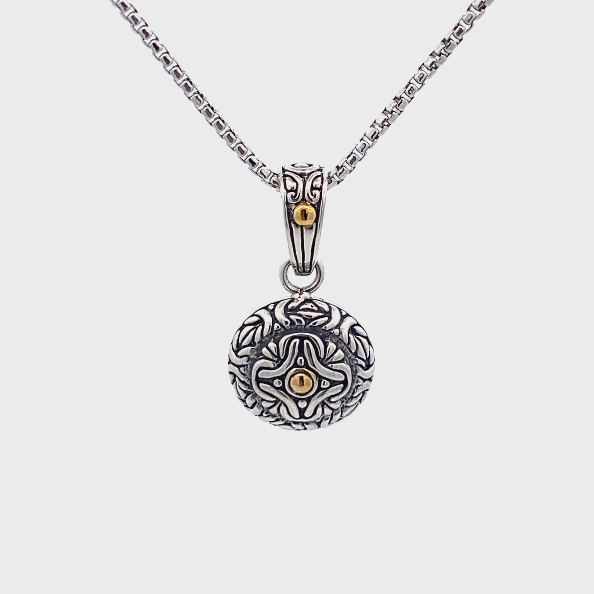The Sonia pendant features a design that is inspired by “wisdom.” Reminiscent of ancient artifacts, the Sonia pendant is a nod to bygone eras that shaped and directed the present-day. This pendant is a reflection and reminder of how our own lives are interconnected with the past, present, and future. Hanging on an 18 inch beveled box chain.