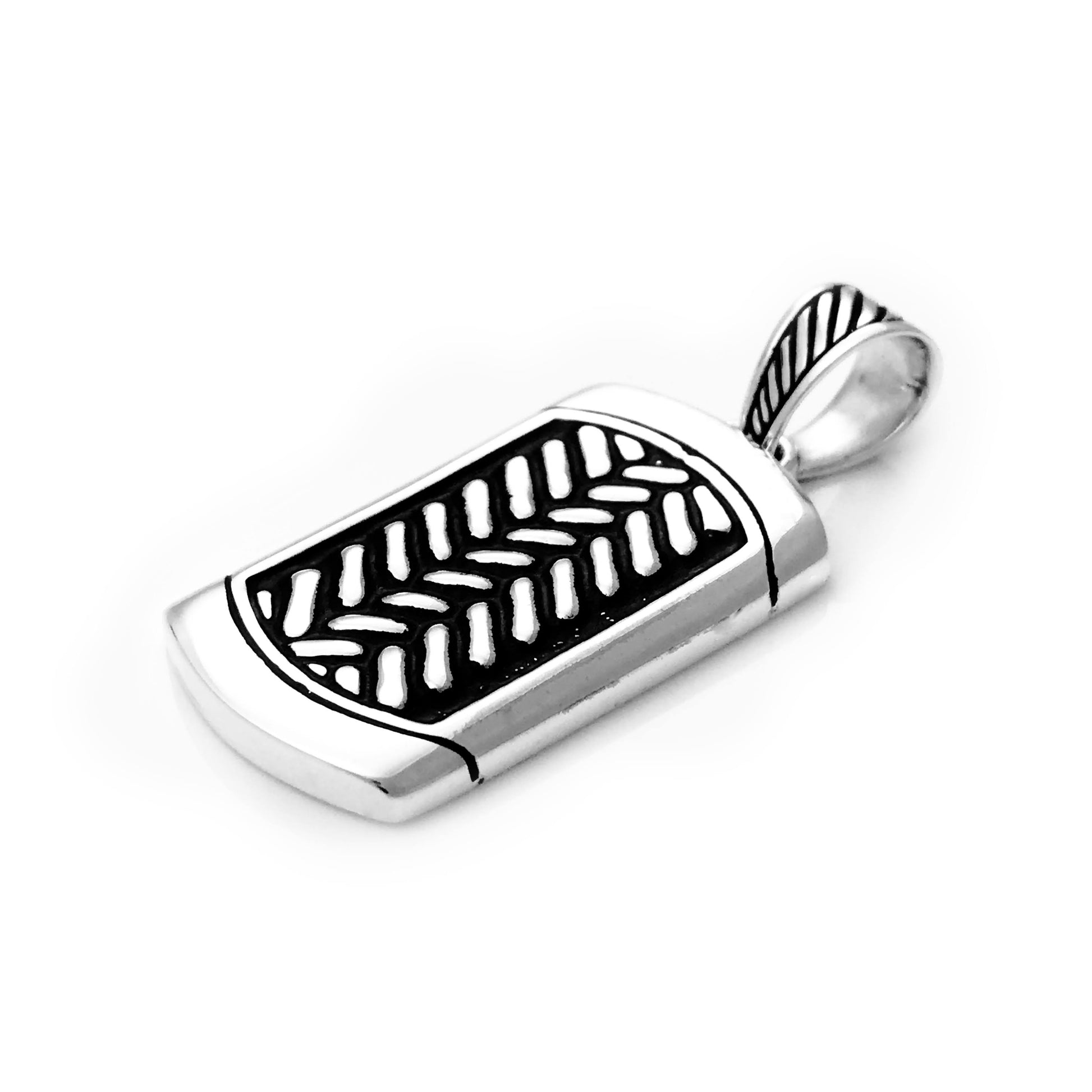 The Vahan pendant is reminiscent of a shield. The shield design of this dog tag variant has offsetting diagonal patterns on the front side, accentuated by black antiquing on the recessed areas. Bold and demanding, this design particularly highlights the essence of resilience and honor.